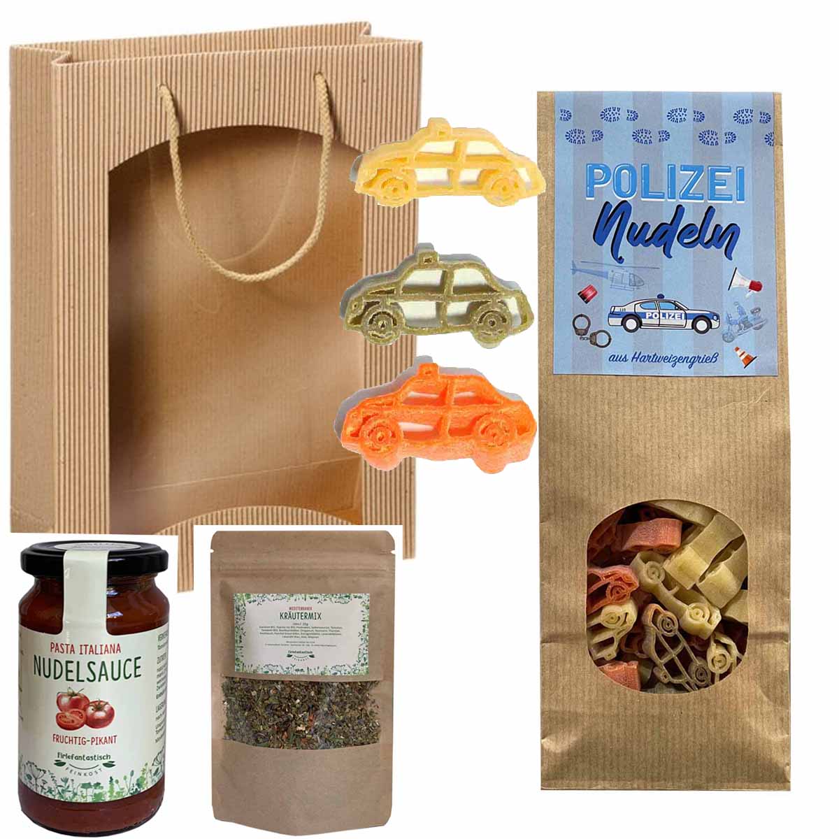 Lustige Nudeln in Form von Polizeiautos machen dieses Geschenk zu etwas ganz Besonderem. Die Polizeiauto-Nudeln, Kräutermix und die leckere Pasta Sauce kommen in der hochwertigen, dekorativen Tragetasche mit Sichtfenster richtig zur Geltung.