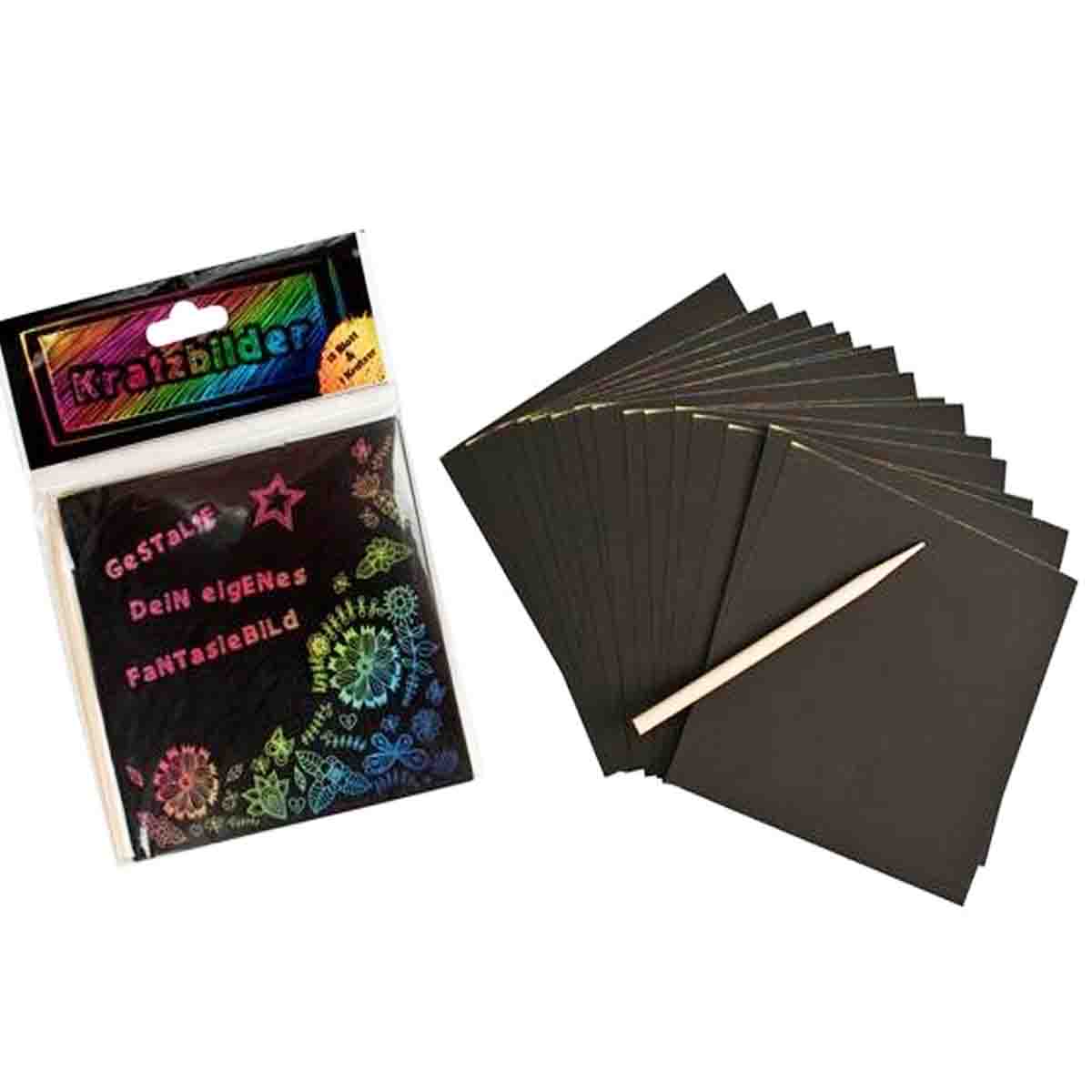 Mit diesem Kratzbild-Set kannst du deine eigenen magischen Bilder gestalten. Kratze die oberste schwarze Schicht ab und hervor kommen bunte Farben. Packung mit 15 Kratzbildern, 8,5 x 8,5 cm, 1 Kratzer Fantastische Bilder können mit diesem Set hergestellt werden. Der beiliegende Holzstab wird wie ein Bleistift gehalten und damit wird die oberste Schicht abgekratzt. Darunter kommt eine neue Schicht zum Vorschein, die in bunten Regenbogenfarben strahlt. Natürlich ist das spannende daran, dass man nie weiß, welche Farben als Nächstes zum Vorschein kommen. Also: Einfach überraschen lassen! Und wenn das Ergebnis doch nicht so gefällt kann an dem nächsten Bild ein neuer Versuch gestartet werden. Denn in dem Set befinden sich 15 Kratzbilder. Diese witzigen Bildchen können aber auch zum Beispiel als Platzkärtchen gestaltet, und mit den Namen der Gäste beschrieben werden. Sicherlich auch ein ganz besonders kreatives Gastgeschenk für die kleinen Gäste. Ganz hervorragend auch als kleiner Reisebegleiter für eine lange Beschäftigung in Zug oder Auto geeignet.